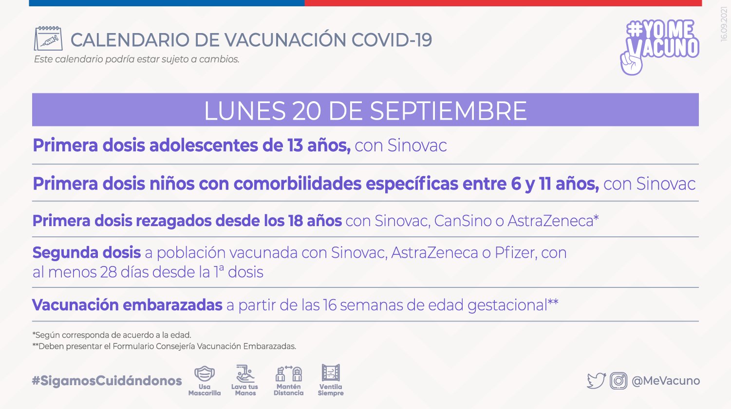 Además, los rezagados desde los 18 años que quieran su primera dosis con Sinovac, AstraZeneca, CanSino. Tanbién los que por calendario les toque su segunda dosis con al menos 28 días desde la primerae dosis. Pueden optar a Sinovac, Pzifer y AstraZeneca.