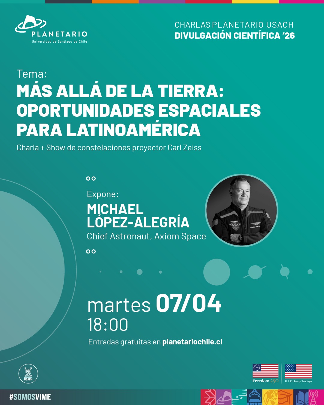 El astronauta de Estados Unidos Michael López-Alegría realizará la charla "Más allá de la Tierra: Oportunidades espaciales para Latinoamérica" el martes 7 de abril, a las 18.00 horas, en Planetario Usach (Alameda 3349). Se trata de un encuentro de carácter gratuito y que es organizado conjuntamente por la Vicerrectoría de Vinculación con el Medio de la Universidad de Santiago, Planetario USACH y la Embajada de Estados Unidos en Chile.