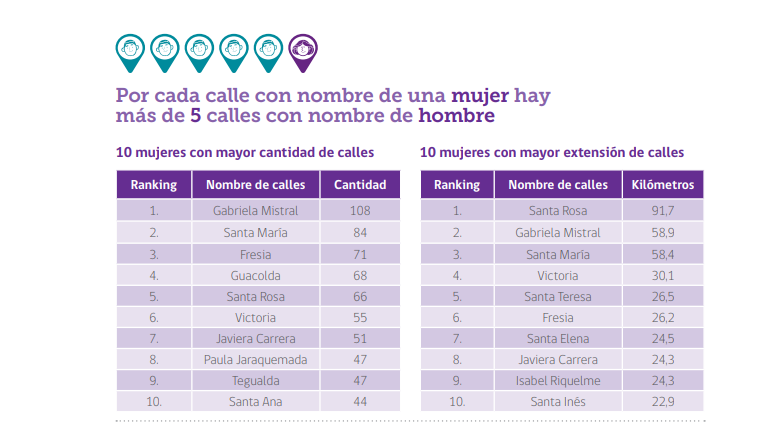 Es en este contexto que el estudio exploratorio del Centro de Estudios de Ciudad y Territorio del Ministerio de Vivienda y Urbanismo (Minvu), publicado en 2023, vuelve a tensionar el mapa urbano con cifras alarmantes. De 99.344 calles analizadas en 99 comunas del país solo un 36% lleva nombre de personas. Y de ese total, apenas un 15% corresponde a mujeres. En términos globales, solo el 5,3% de las calles en esas ciudades tiene nombre femenino, pese a que el 50,9% de la población urbana es mujer. En resumen, por cada calle con nombre de mujer, hay más de cinco con nombre de hombre.