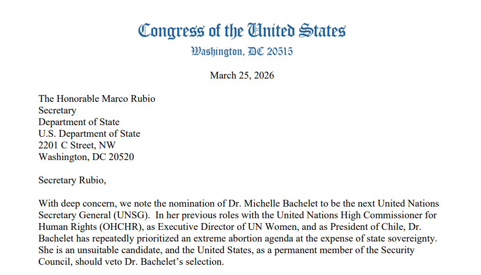Para los legisladores que firmaron la carta enviada a Marco Rubio, la selección de Bachelet sería contraria a los intereses nacionales y a la necesidad de una ONU que priorice la transparencia y la paz internacional por sobre agendas que consideran divisivas.