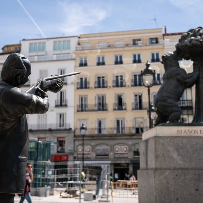 El artista chileno Nicolás Miranda hizo una escultura del Rey Juan Carlos apuntando con un rifle de caza al Oso y el Madroño en la Puerta del Sol, un ícono en Madrid, con el fin de de "ridiculizar la figura del monarca".