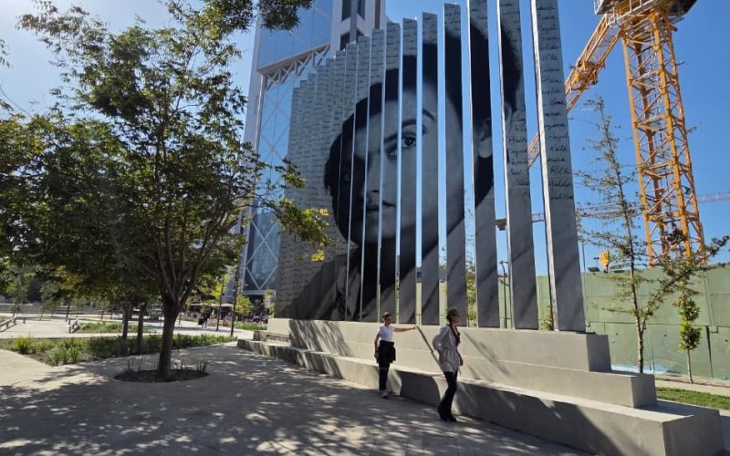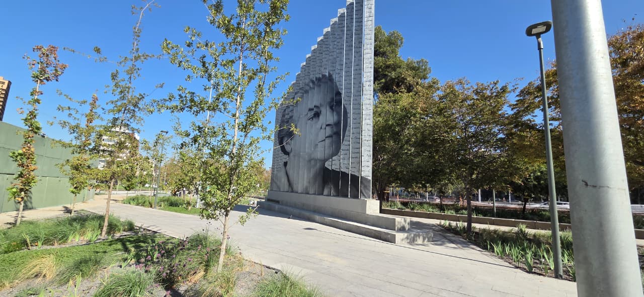 Se trata de la obra “Lucila”, un monumento de gran formato que alcanza 10 metros de altura por uno de sus costados y 7,5 metros por el otro. La estructura exhibe imágenes impresas de la poeta en cada una de sus caras, junto a fragmentos de su obra, que ahora pueden apreciarse con claridad en la zona donde se construye el nuevo nudo Baquedano.